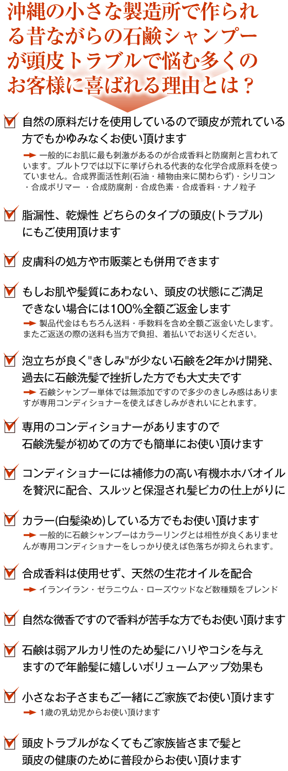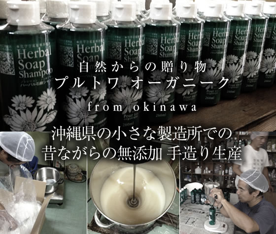 プルトワでは古来そうであったように自然の原料を使うヘアケア製品を現代風にリバイバルしました。石鹸は歴史のある非常に安全な洗浄剤ですがアルカリ性のためどうしても髪がきしみ使用感がよくありません。そこで石鹸をもう一度見直しました。髪を洗うことだけを目的とした洗髪専用の石鹸と専用コンディショナーを開発したのです。