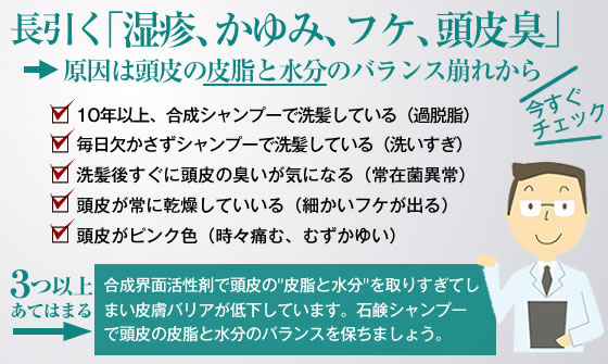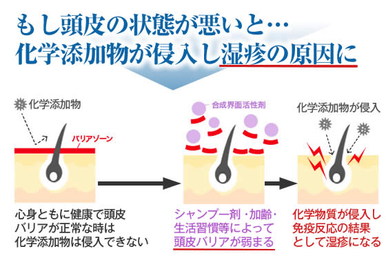 現在、男女問わず頭皮のかゆみ、湿疹、フケなど頭髪トラブルが大きく問題視されていますが、それも合成シャンプー・合成リンスが登場したここ数十年の事なのです。