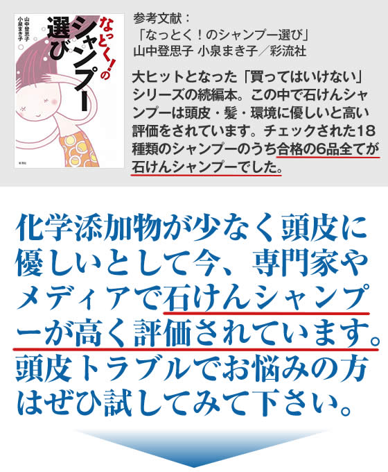 わたしは、アトピー体質で全身の肌トラブルと30年付き合ってきました。10年前からは、頭皮にもトラブルをかかえるようになりフケや痒みに悩み、それを誰も言えずにいました。あまりにも、頭皮のトラブルが酷いので皮膚科に行きましたが、薬を使っても改善せず、もぉこれは一生の悩みなんだと思っていました。たまたま携帯サイトでこのシャンプーの説明と使用者の感想などを見て、ダメもとで注文してみました。以前にも、似たような石鹸シャンプーは使ったことがあってので、泡立ちはそれよりも良く洗いあがりもサラサラしていると思いました。完全にフケと痒みがなくなったわけではありませんが、市販で売られているシャンプーを使用していた時より地肌の乾燥は抑えられていていると思います。何より感激したのが頭皮の臭いがなくなったのがとても嬉しかったです。以前までは、痒みが酷かってのでシャンプーしながら地肌を掻いていると洗ったばかりなのに、嫌な頭皮の臭いがしてきてとてもストレスでしたが、このシャンプーは頭皮の臭いが改善されていました。値段は高いですが、それなりの効果は期待できると思います。ありがとうございました。