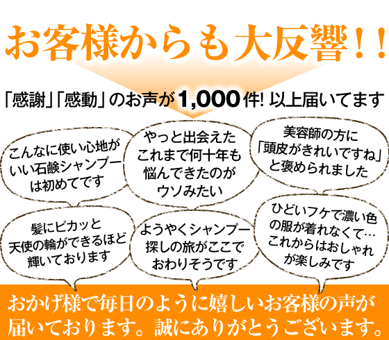 長年細かいふけ、痒みに悩んでおりました色々な無添加石鹸シャンプーを試しました。通販でnatureシャンプー、最近ではごまシャンプーを使っていましたが、改善には至りませんでした。毛髪は櫛通り、艶もよく満足でしたが、頭皮は全く改善しませんでした。市販の痒み止め、柑気楼も気休めでしかありませんでした。元々、市販のシャンプーを使用すると痛痒くなりますので、添加物や薬分の多いタイプは使用できません。無添加シャンプーを探すしかありません。御社の製品は今の所、全てクリヤー、快適です。頭皮あっての毛髪やっと両方に満足できる製品に出会えたと信じたいです。増々のご発展をお祈り致します。